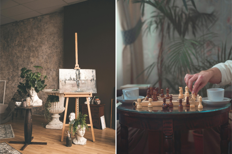 L’importanza della buona compagnia viene richiamata dalla presenza di giochi da tavolo intellettuali, a cominciare dagli scacchi. Le scacchiere di buona fattura risultano significativi oggetti di décor da sfoggiare.